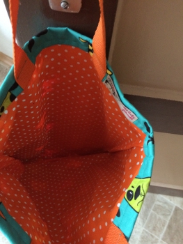 innen mit orange-weiß gepunktetem Stoff gefüttert