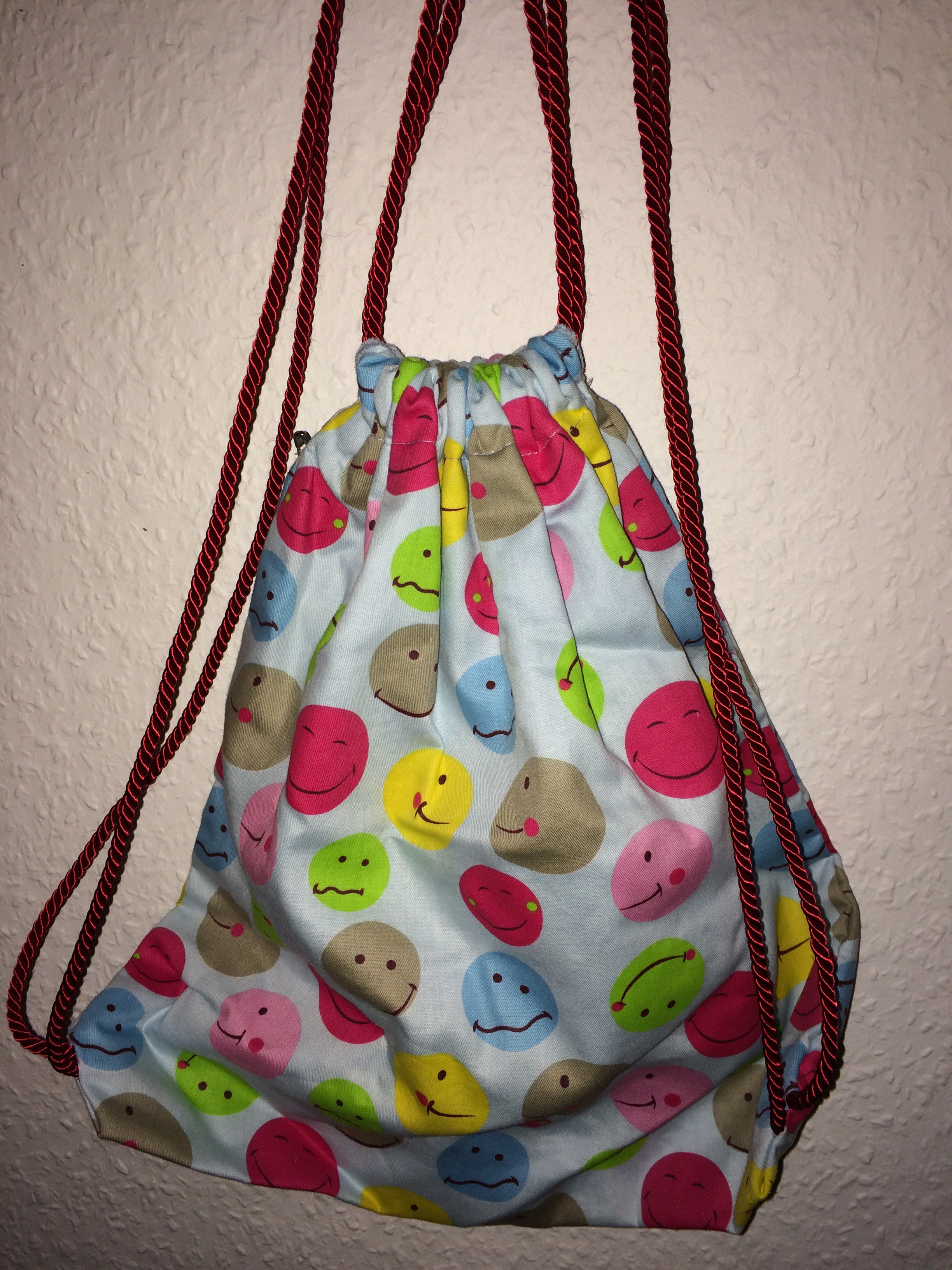 Mit bunter Kordel, kann über der Schulter oder auf dem Rücken getragen werden